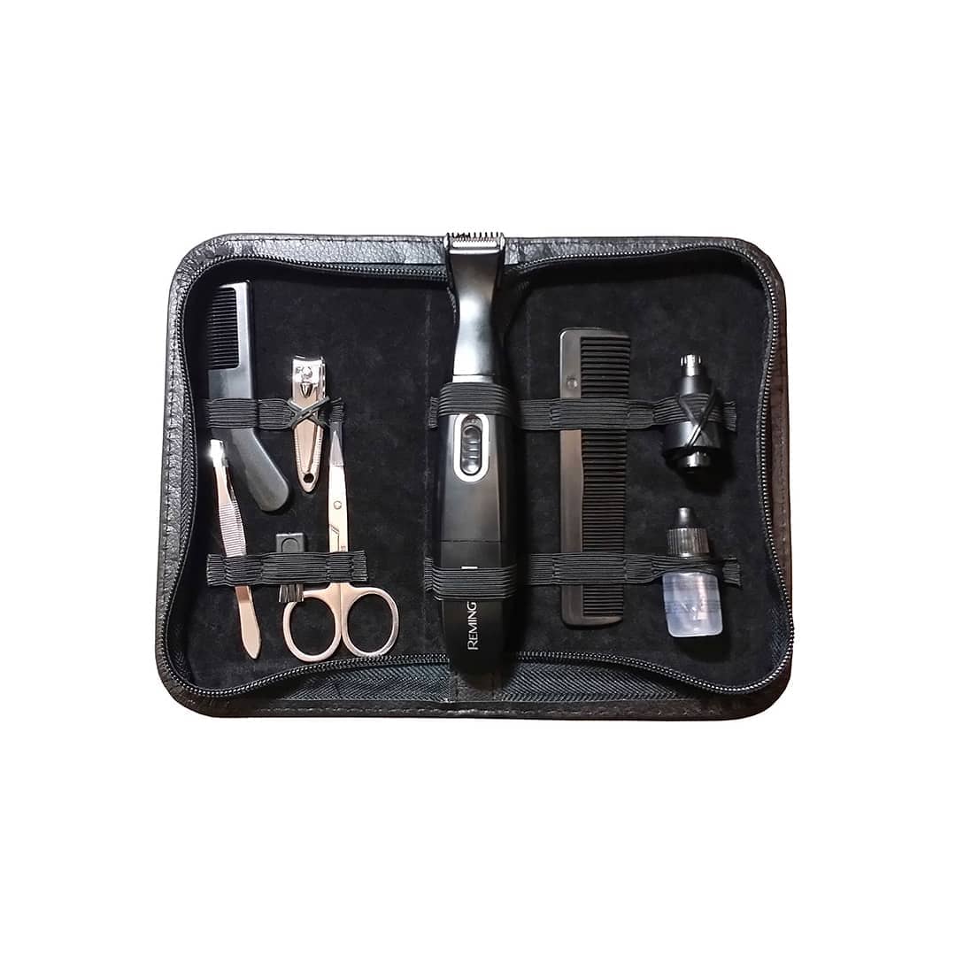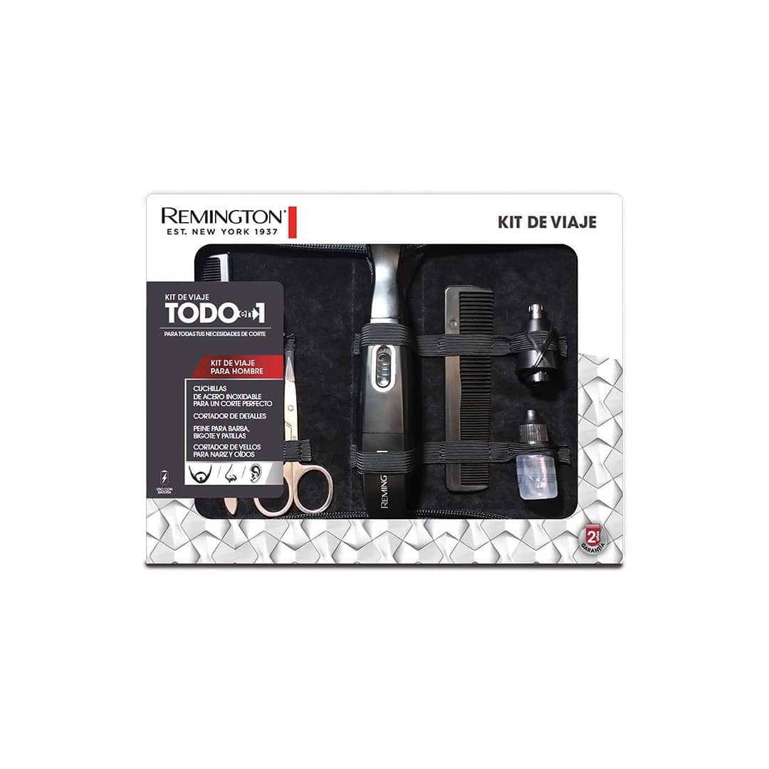 El kit Remington Travel Grooming se distingue por su completitud, incluyendo una recortadora de barba para mantener la barba y el bigote en perfecto estado, una recortadora de hoja para detalles precisos, y una detalladora para el cuidado de la nariz y las orejas.